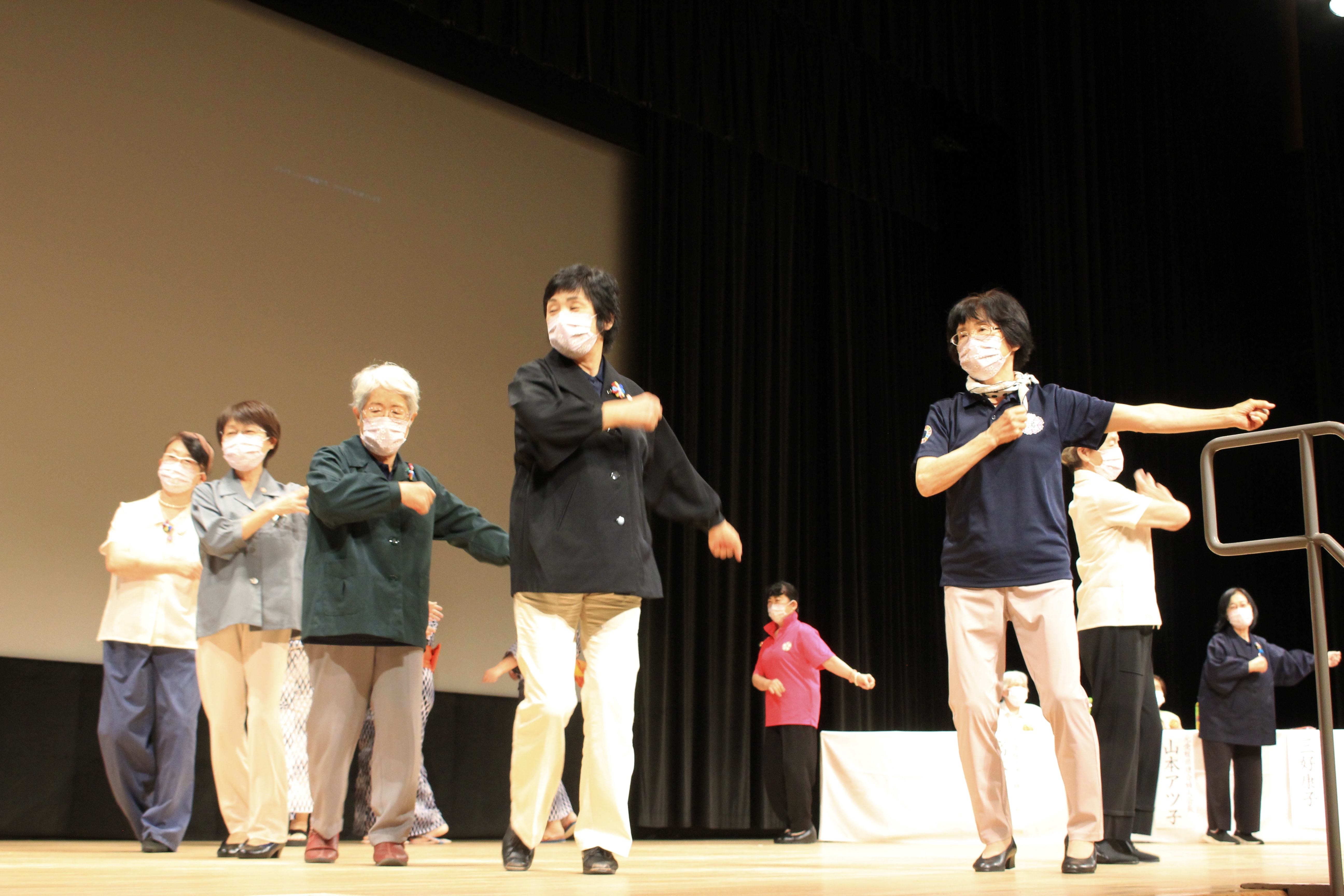舞台の両端の方が着ているポロシャツ(ピンク・紺)は平成、令和になってから作成した県連婦のポロシャツです。