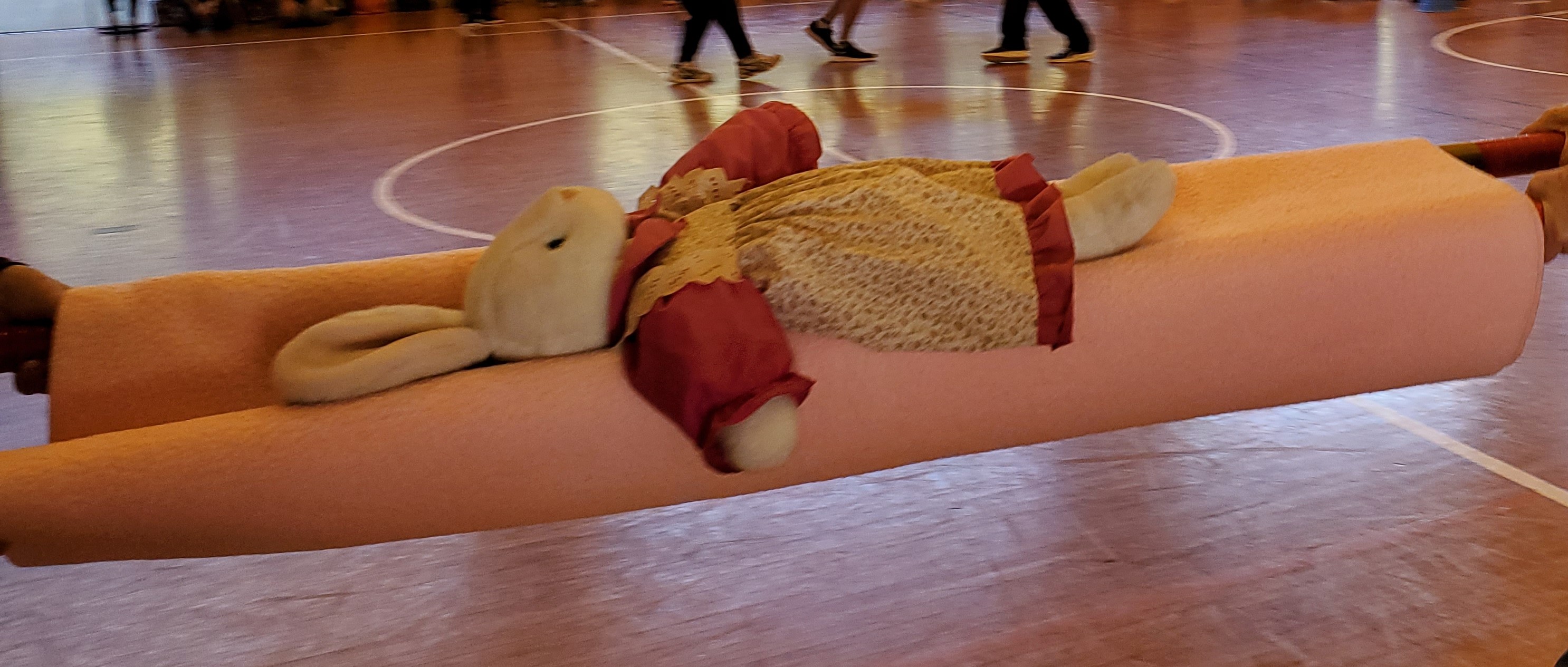 「ケガ人が出ました!急いで運びましょう!」…これは竹と毛布で作った即席タンカーでケガ人(役)を運ぶリレーです!