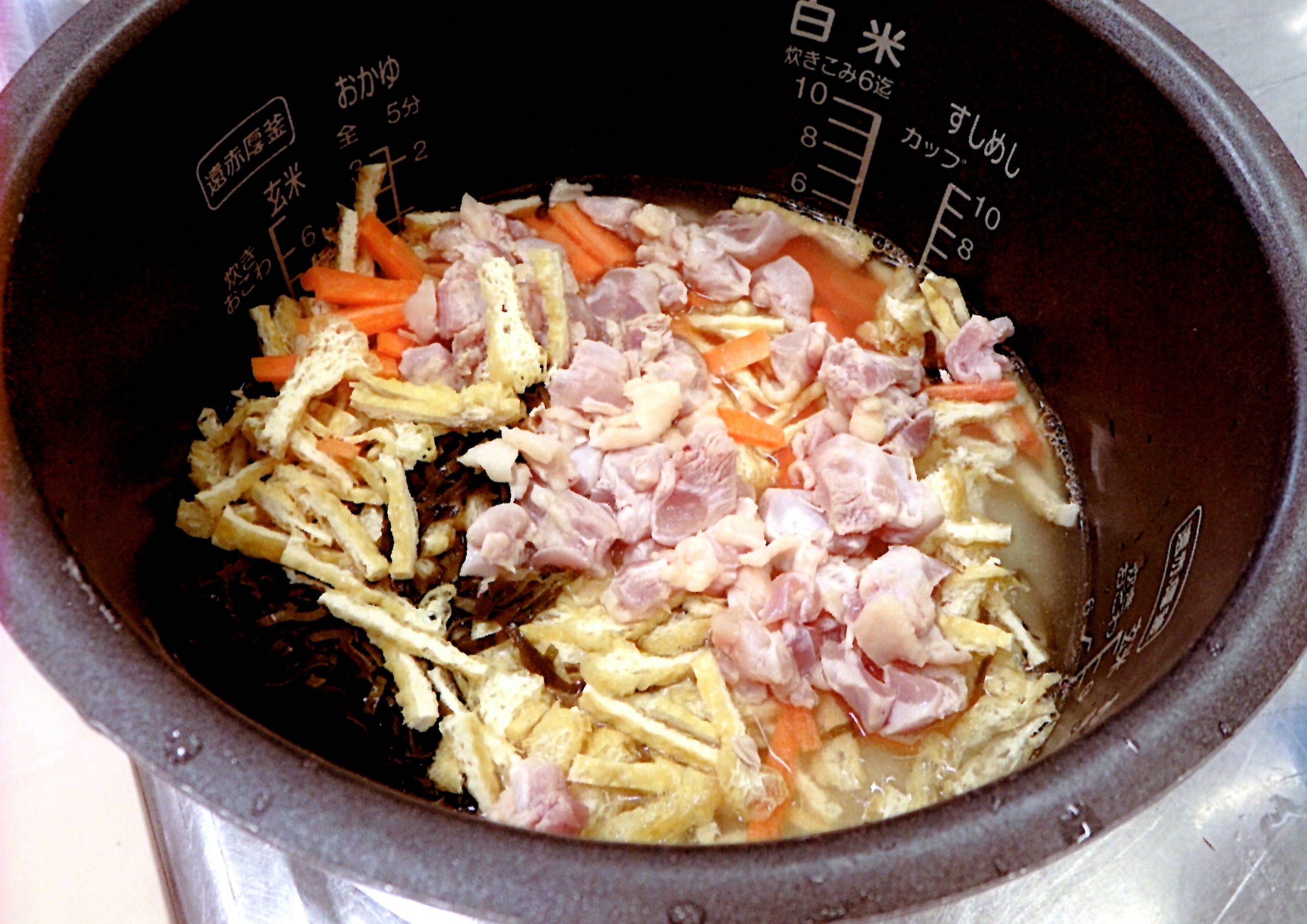③ 炊飯器に米、水、①②、ちりめん、★調味料を入れて炊く