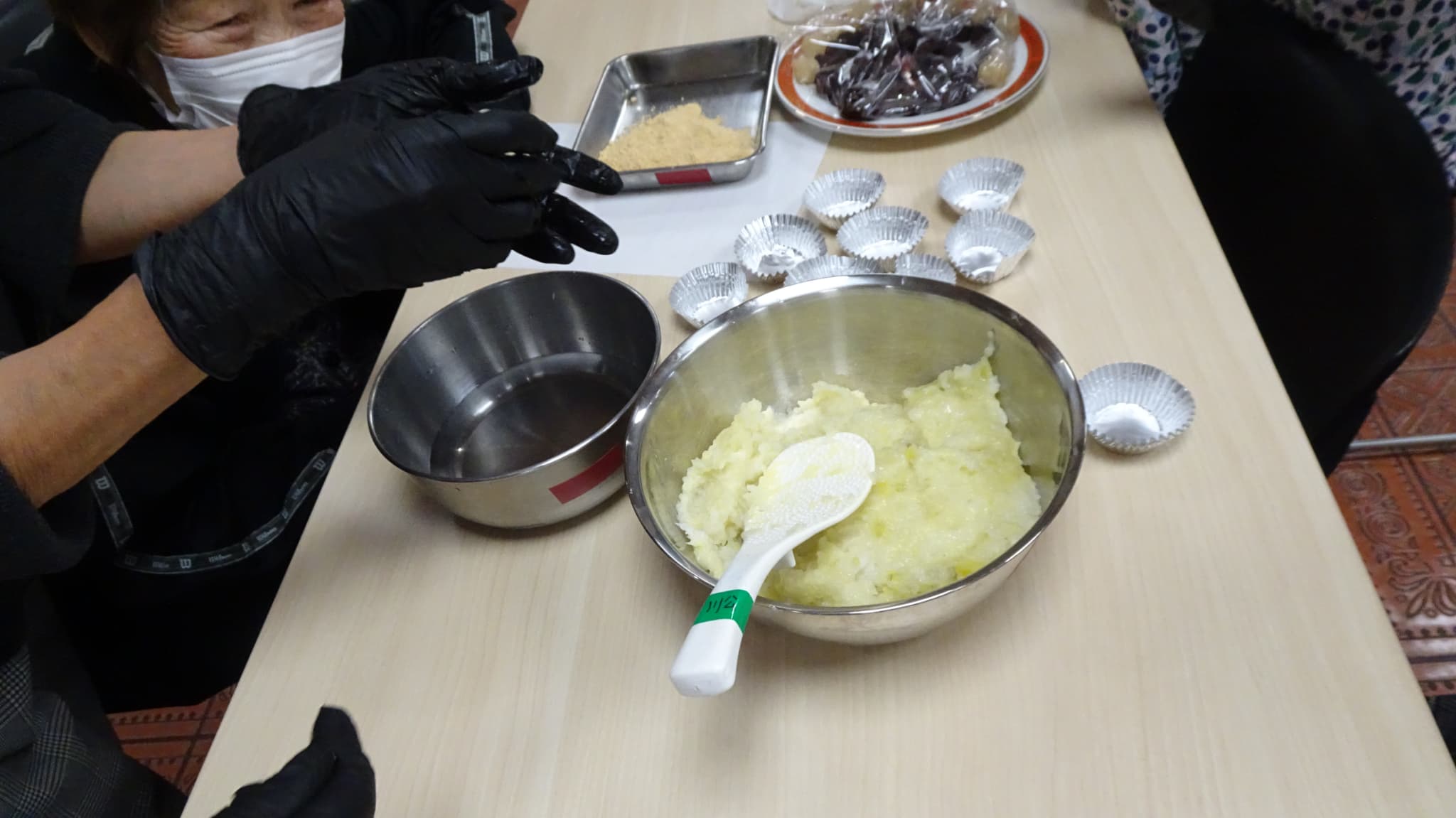 ↑みなさんが昆布料理を作っている間にはがま餅の準備中